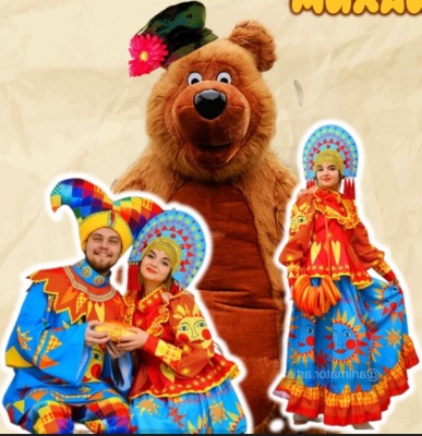 Ведущие данной программы - Скоморох Петрушка, Весна-Краса и ростовой медведь 2,5 м
